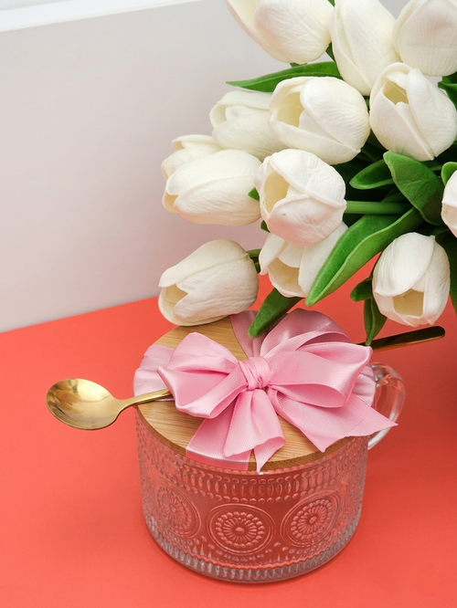 Add a touch of elegance to your space with this beautifully designed glass jar, featuring delicate textures, a soft pink bow, and a luxurious gold spoon.